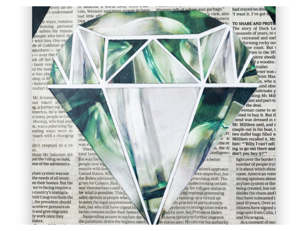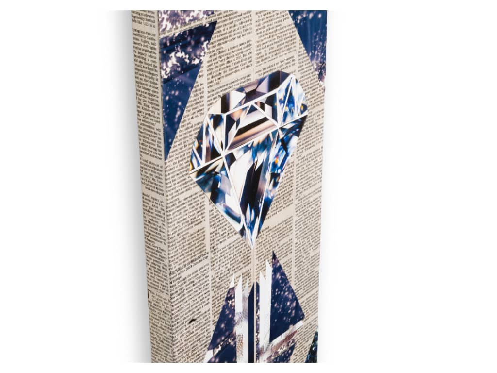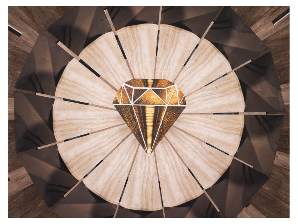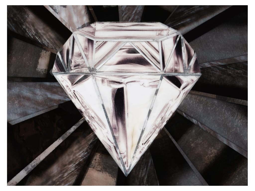 Two figures, one is light, the other is shadow, gracefully mix in an eternal dance. With diamonds at their hearts